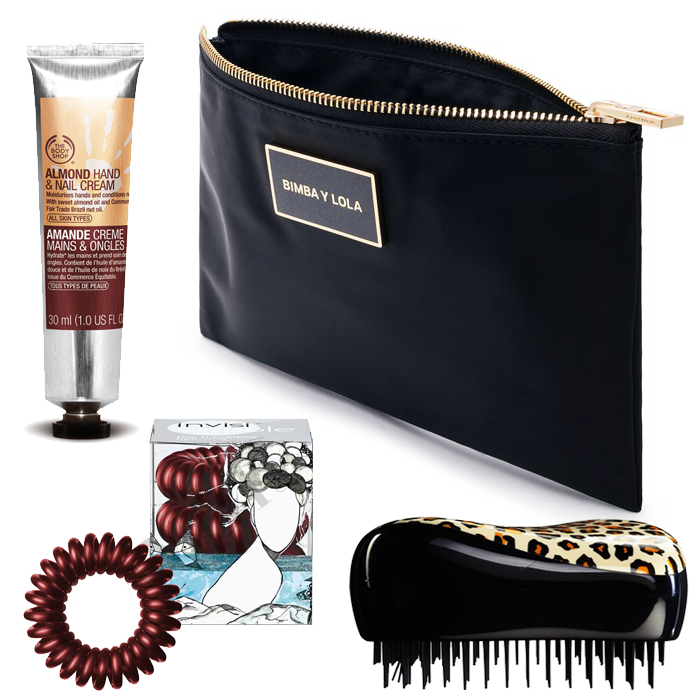 Eu sou uma apaixonada e sei que vocês também gostam muito, por isso escolhi uma Necessaire Bimba Y Lola, preta com o logotipo brilhante e dourado, é linda mas achei-a tão "flat" que decidi encher com algumas coisinhas que também fazem parte do recheio qualquer bolsa de cosméticos como deve de ser, portanto além da necessaire vão receber também uma escova de cabelo compacta Tangle Teezer para dar um jeito ao cabelo em qualquer lugar, uma caixinha de 3 elásticos Invisibobble que podem literalmente salvar a vida a nós próprias ou a uma amiga e por fim mas não menos importante um creme de mãos The Body Shop para manter as mãos suaves e hidratadas durante todo o dia.