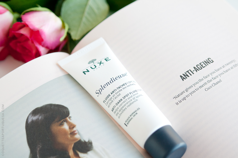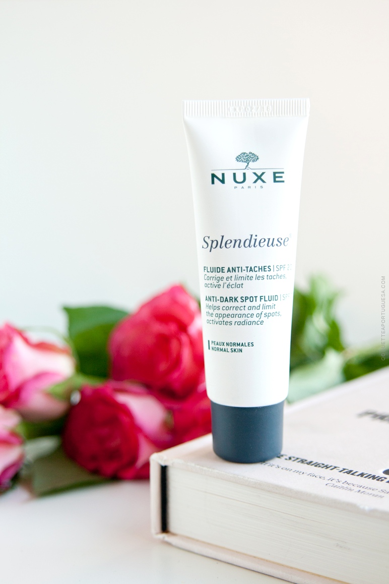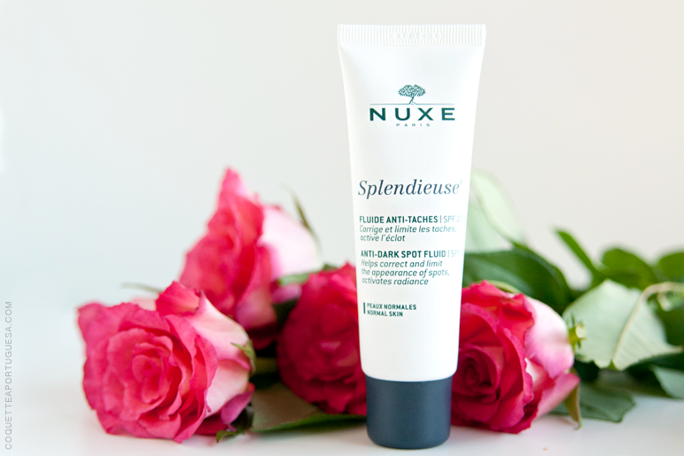 Desta vez experimentei nas últimas semanas o creme diário NUXE Splendieuse Fluid SPF20, um creme especialmente concebido para aclarar, tratar e prevenir manchas, também podendo ser utilizado como aclarador geral para maior luminosidade da pele no seu todo. Há duas versões deste creme, o fluído que serve para peles normais a oleosas e o creme para peles normais a secas, optei por experimentar o fluído já que a minha pele tem mais tendência a ser mista durante as estações de mais calor.