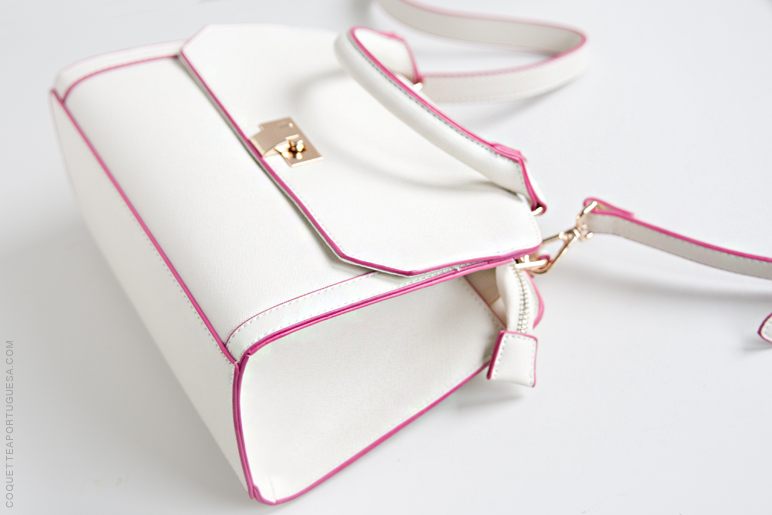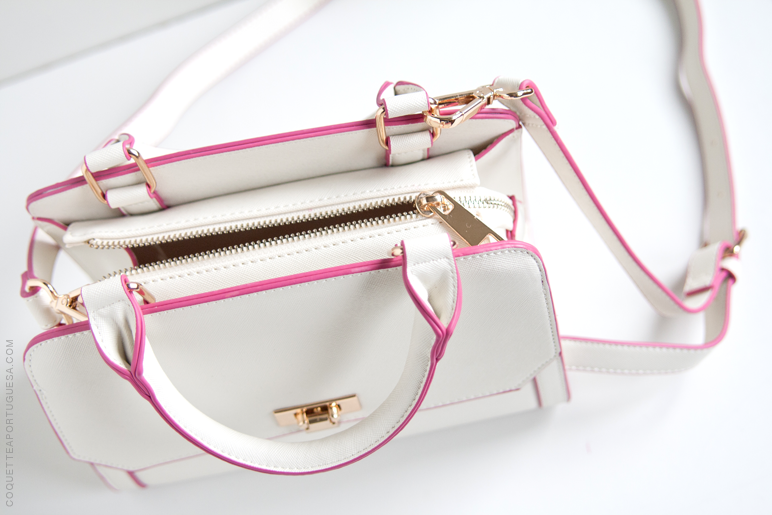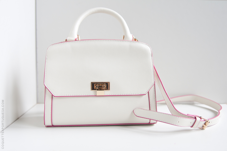 Aquela mala média/pequena onde cabe tudo o que precisamos para uma saída seja dia ou noite. É este o tamanho, é a minha primeira mala branca, nunca liguei muito ao branco no que toca a acessórios, só tenho mesmo t-shirts, camisas e vestidos. Mas de alguma maneira apaixonei-me quando vi esta pequena mala da Accessorize com detalhes em cor-de-rosa, perfeita para este Verão!