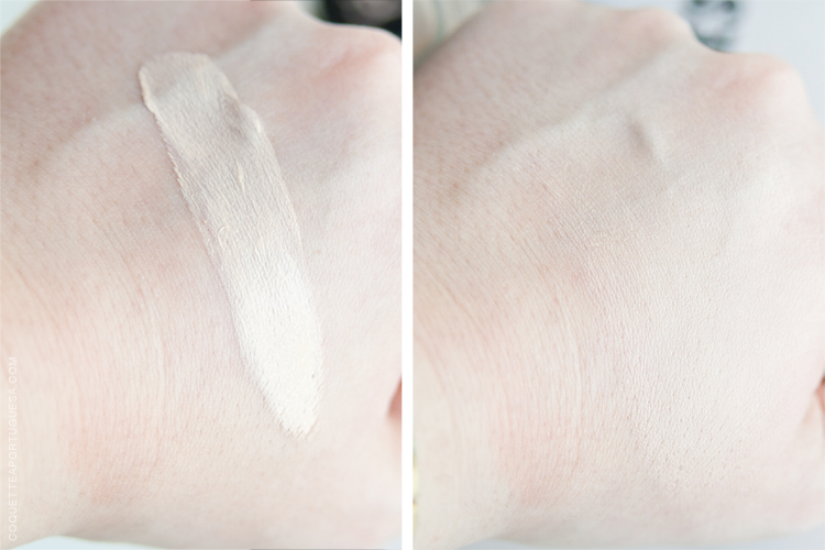 - Textura/Acabamento - Tem uma textura cremosa e consistente, depois de aplicada fica mais mate do que outra coisa, é verdade, diz ser uma base luminosa e tal, mas o acabamento é mate ao toque e ao olho nu, a parte da luminosidade e "glow" só entra em acção quando contra uma luz directa, por exemplo na rua com o sol, à noite com as luzes fortes, só ai conseguimos ter a percepção do glow dela, reflecte as luzes, em luz natural ou interior não se nota, fica com um ar pele normal/mate, não é daqueles mates super secos, falsos e pesadps, fica relativamente natural. No meu caso não me chateia muito porque gosto de acabamentos mate, mas para quem não gosta e estava à espera de uma base mega "glowie" será uma desilusão ou uma má aposta.