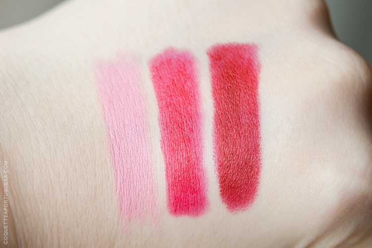 Adoro os dois vermelhos, o rosa clarinho infelizmente não me ficaria tão bem :(
