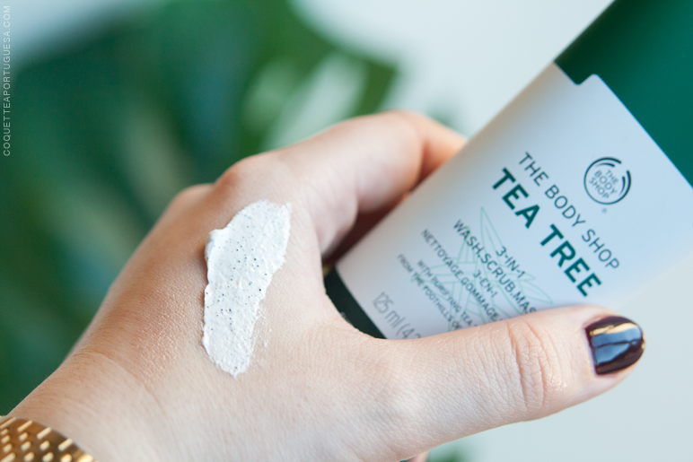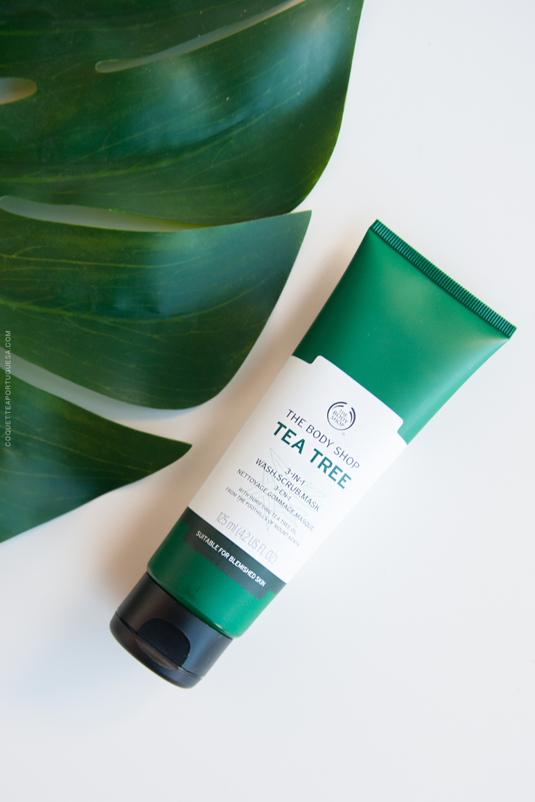 É o caso da nova máscara The Body Shop Tea Tree 3 in 1 Wash Scrub Mask (125ml). Uma máscara 3 em 1 que pode ser utilizada para limpar a pele, esfoliar ou máscara purificante.